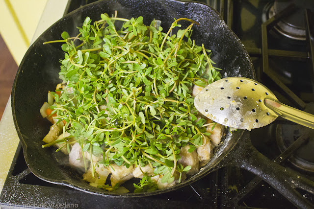 Add verdolagas and combine. One handful of prepared leaves per serving, and one or two for the pot. Cover and store unused verdolaga.